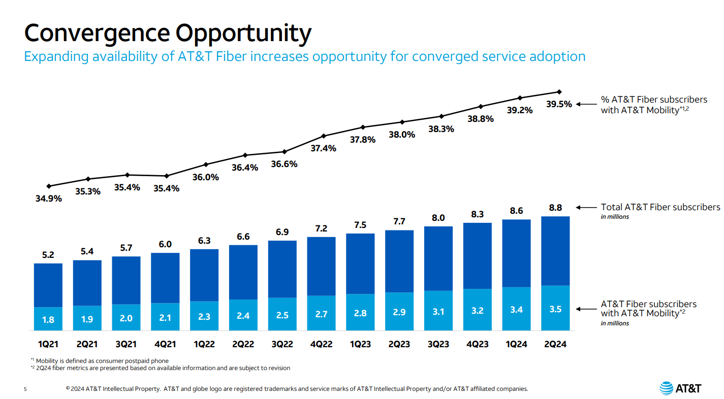 AT&T has demonstrated its market leadership through its fiber and 5G strategy. AT&T has championed the convergence thesis, seeing significant synergies and cross-selling strategies, leading to a more unified and seamless customer experience. Given the continued growth in “converged service adoption,” as seen above, the market is likely increasingly confident about the convergence strategy. Therefore, I assess that the company’s ability to potentially maintain its market leadership in fixed broadband access and wireless services has been bolstered.