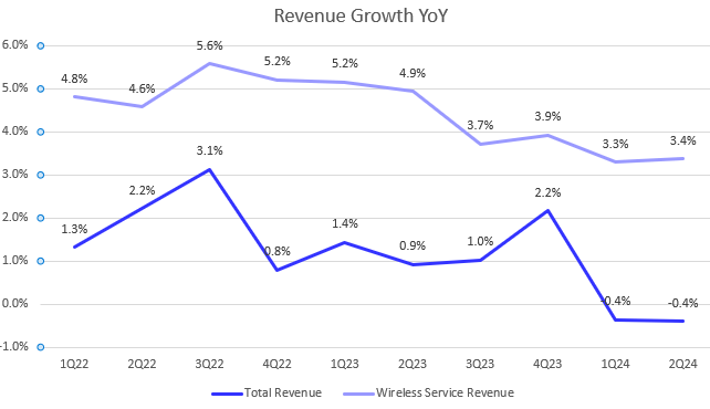 Let’s look at T’s 2Q earnings. The company’s total revenue declined by 0.4% YoY, missing the market consensus, driven by continued declines in the Business Wireline and Wireless Equipment segments. As shown in the chart, AT&T’s top-line growth is largely supported by its Wireless Service segment, which has maintained a 3% YoY growth range. The company expects this segment to continue growing at a 3% YoY range for FY2024.