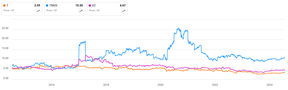- The stock is currently trading at 3.6x P/CF TTM, which is below its 10-year average and 55% lower than the sector average, with other valuation multiples also being lower than those of VZ and TMUS.
