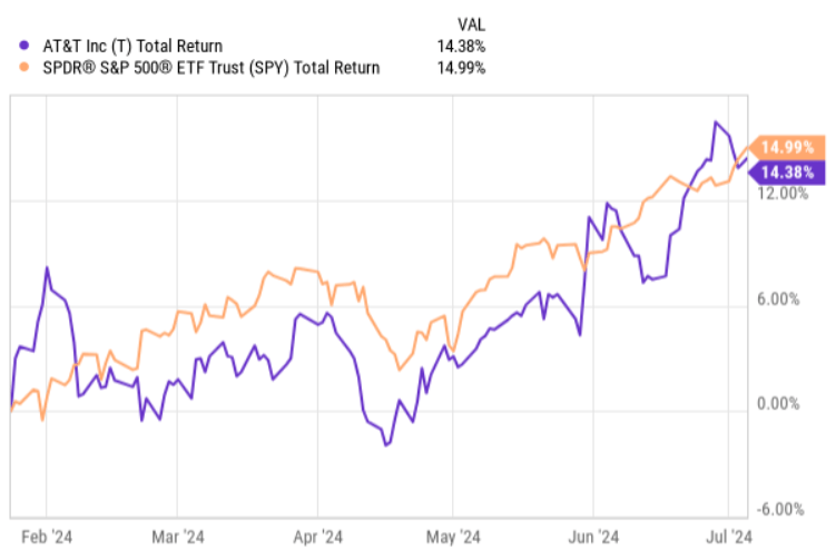 As we can see in the chart below, T has continued to deliver sound returns after the issuance of Q4, 2023 and Q1, 2024 earnings report. In fact, the recovery process has been so strong making T’s total performance almost exactly in line with that of the broader (growth focused) market.