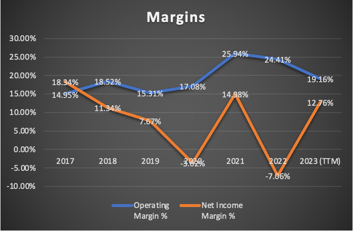 Margins increased, with the net income margin increasing from -7.22% to 12.76%. Meanwhile, operating margin decreased from 23.02% in Q2 2023 to 19.16% in Q4 2023.