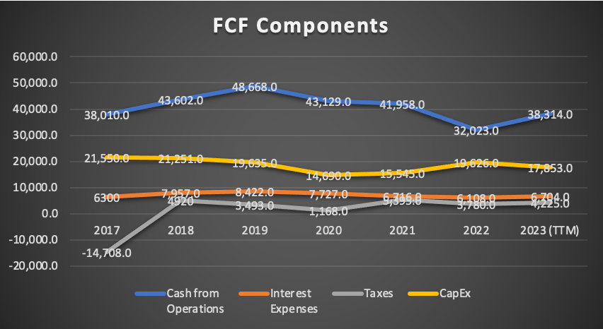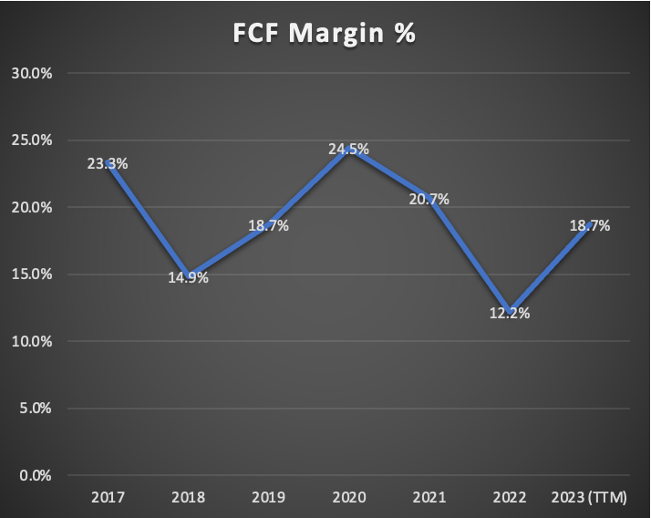 Despite challenges, free cash flow remains robust, with AT&T currently generating $22.9 billion on a trailing twelve-month basis. This reflects a commendable increase from Q2 2023 of approximately 9.5%. The free cash flow margin also stands at a respectable 18.7%, marking an improvement from Q2 2023’s 17.3%. Furthermore, the company is spending around $8.1 billion in dividend payments, if you subtract that, you will get that the company still has around $14.8 billion of cash flow available.