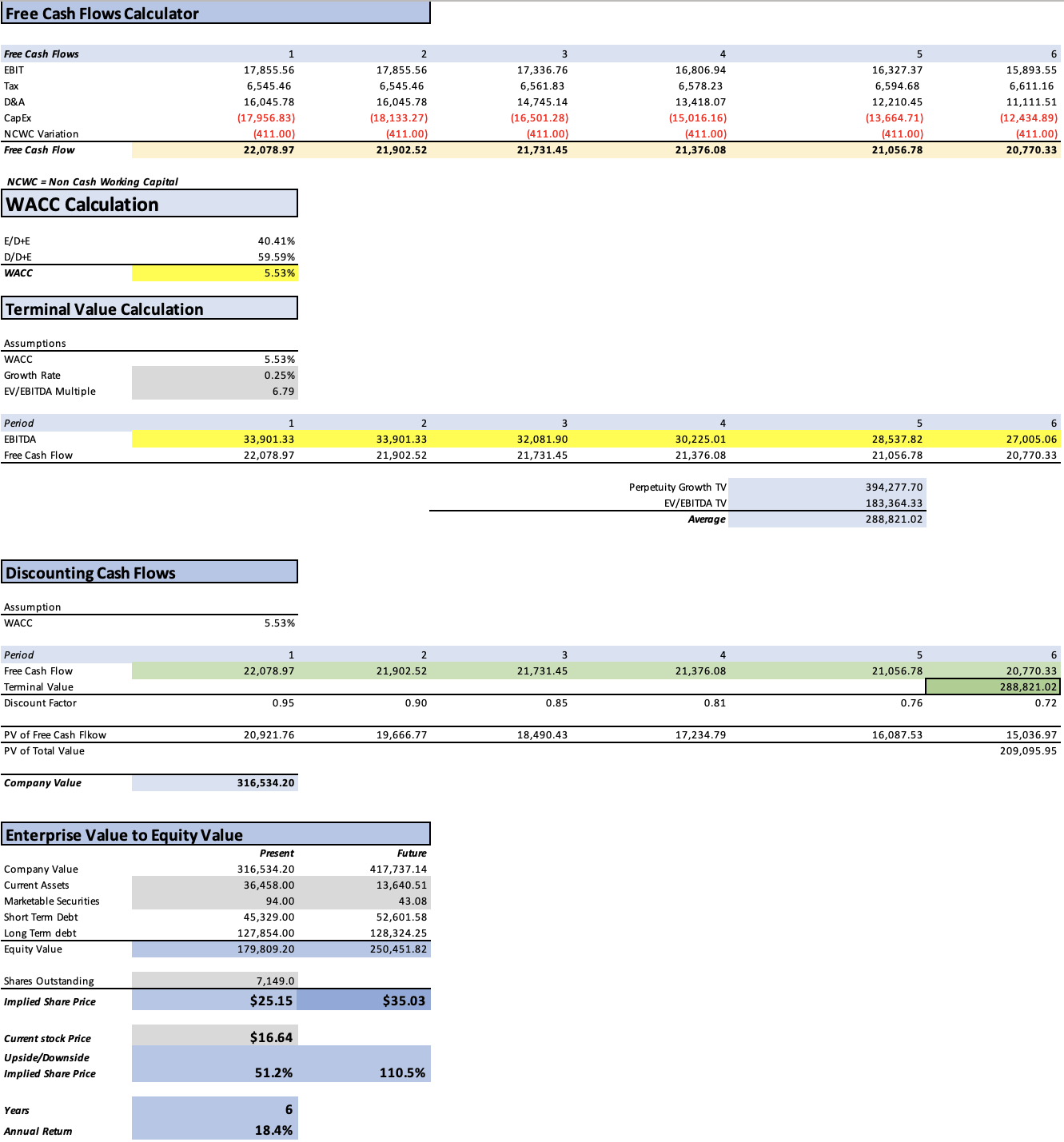 Moreover, to derive the perpetuity growth rate, one should divide the growth rate by the difference between the WACC and the growth rate. This calculation yields a perpetual growth rate of 1.04%. As demonstrated, I prefer to calculate it using a formula, as I find it more credible than making assumptions.