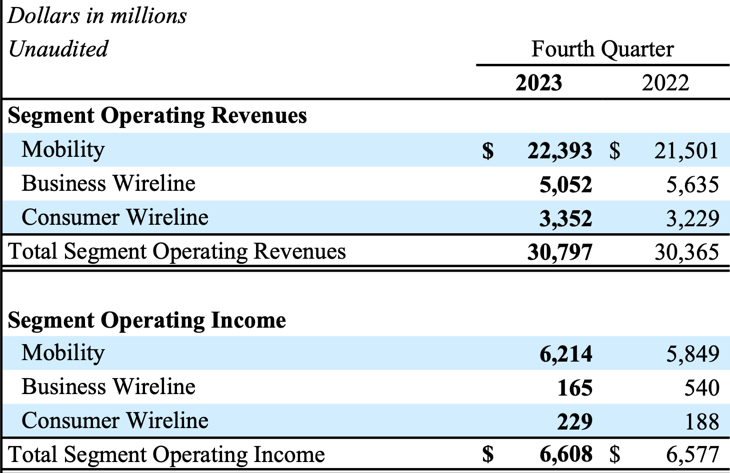 An examination of the Q4 2023 extract below reveals that mobile data and equipment (aka mobility) stand out as the primary contributors to AT&T’s revenue.