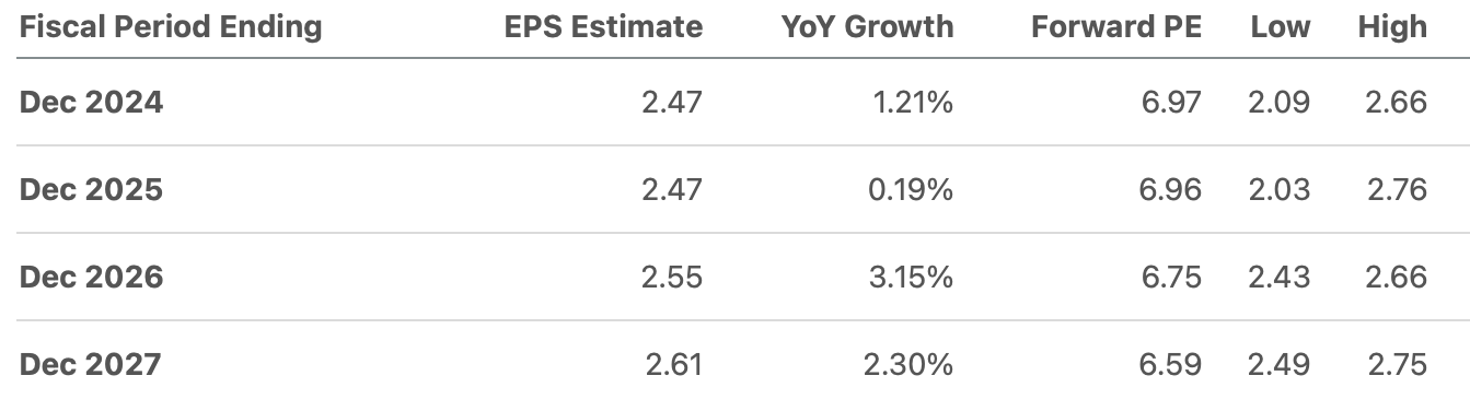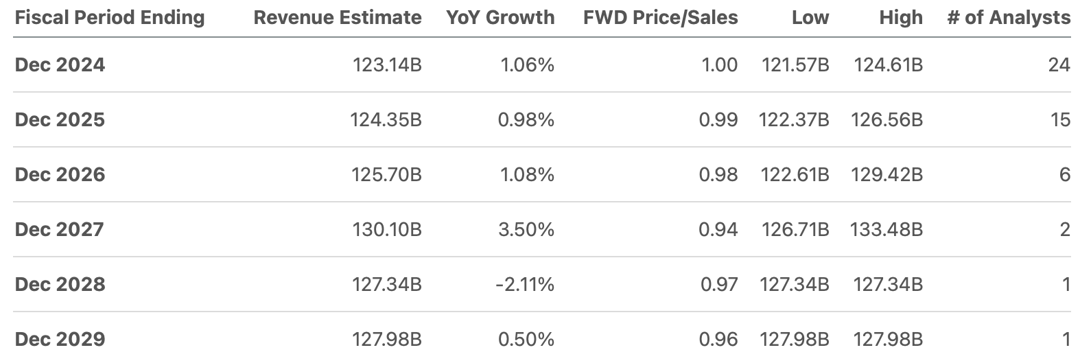 The financial projections for the company indicate a revenue of $123.14 billion for FY2024, with an expected increase to $124.35 billion for FY2025. The EPS forecasts are $2.47 for FY2024 and FY2025 (Yes, no change), resulting in net incomes of $17.6 billion and $17.65 billion, respectively. A forward revenue growth of -9% is estimated, as well as a 3 to 5-year long-term EPS growth rate of 0.25% (which will be used to calculate perpetuity growth), forming the basis for projecting net income in the model beyond FY2025.