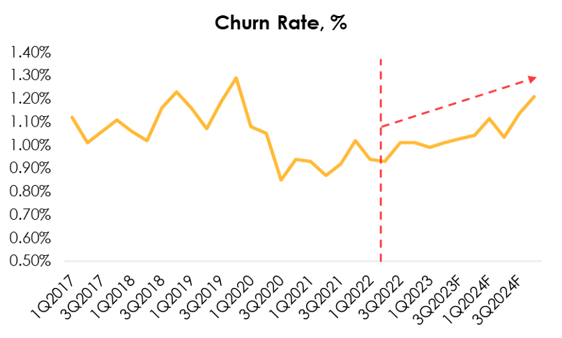 Churn in the wireless communications segment remains low: It was 0.99% in 1Q, compared with our forecast for 1.03%. We’re expecting churns to get higher due to WM spin-off, which used to be an additional factor of customer retention (Promo HBO Max subscription.)