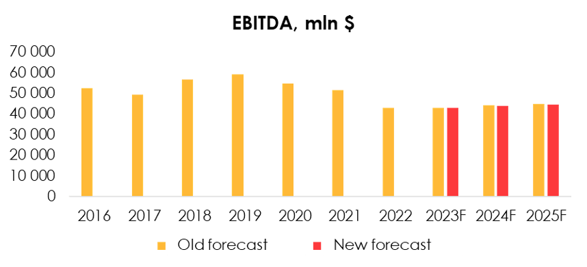 We are lowering the adjusted EBITDA forecast from $43 051 mln (+3.8% y/y) to $43 042 mln (+3.8% y/y) for 2023 and from $44 022 mln (+2.3% y/y) to $43 926 mln (+2.1% y/y) for 2024.