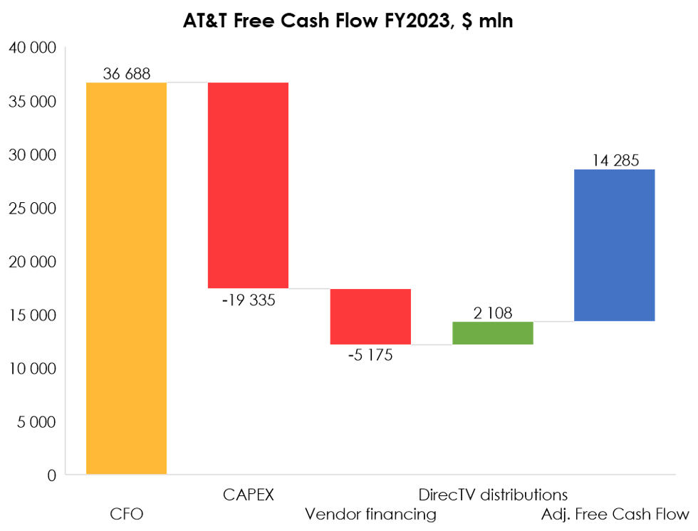 With total FY23 FCF of 14.3 bn, dividend payment of $8.5 bn and net debt outflow of $3.2 bn, excess cash will be around $2.6 bn, which leaves T in stable cash position by the end of the year, so we believe that this year dividend is completely secured.