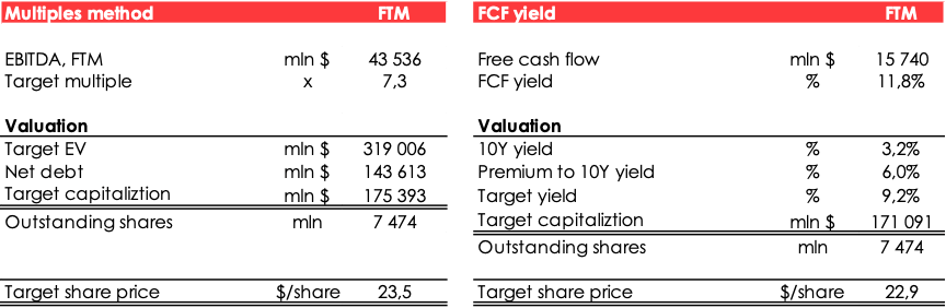 We’re evaluating AT&T prices based on FTM EV/EBITDA multiples and FCF Yield. We are maintaining the fair value price for the shares at $23.2 (average price between EV/EBITDA and FCF Yield methods).