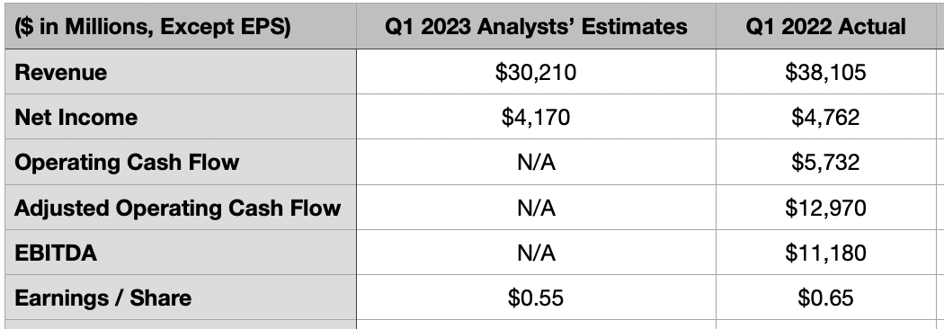 On the bottom line, analysts are anticipating earnings per share of $0.55. That would work out to roughly $4.17 billion in net profits if the company’s share count has not changed materially from what it was at the end of the 2022 fiscal year. For context, earnings per share in the first quarter of last year totaled $0.65, translating to net income of $4.76 billion. Again, changes to the corporation are likely most responsible for this. After all, WarnerMedia on its own was responsible for operating profits of $1.32 billion at that time. Analysts have not provided guidance when it comes to other profitability metrics. But there are some that investors should pay attention to. For context, operating cash flow for the company in the first quarter of 2022 was $5.73 billion. Though if we adjust for changes in working capital, it would come in at $12.97 billion. Meanwhile, EBITDA for the company was $11.18 billion.