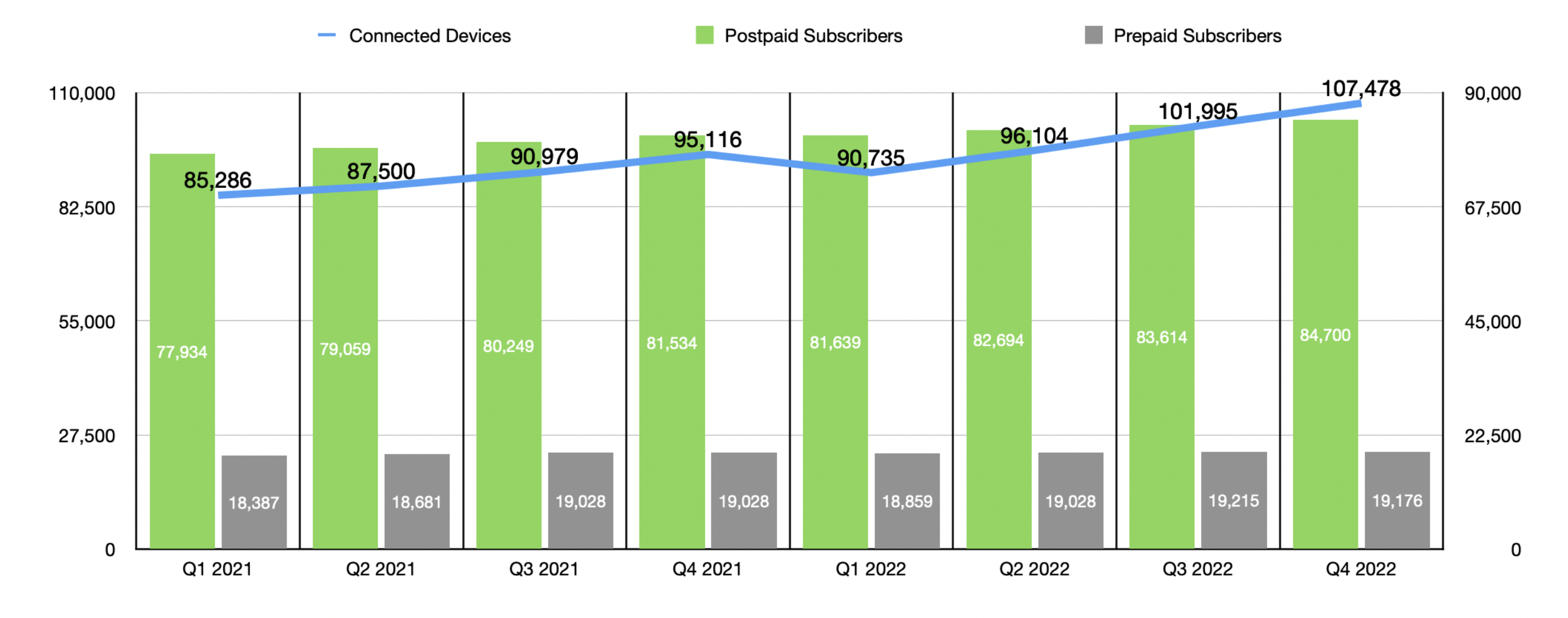 Personally, I believe that any concerns on this front are overblown. The fact of the matter is that IoT is almost certain to continue growing for the foreseeable future. According to one source, the number of connected devices, globally, should have been about 13.1 billion last year. That compares to just 8.6 billion seen in 2019. And by 2030, that number is expected to expand to 29.4 billion. Though not exactly high growth, both postpaid and prepaid subscriber data will also be important for the company. For context, in the fourth quarter of last year, the company boasted 656,000 net additions under its postpaid phone activities. This was a rather significant increase compared to what analysts anticipated.