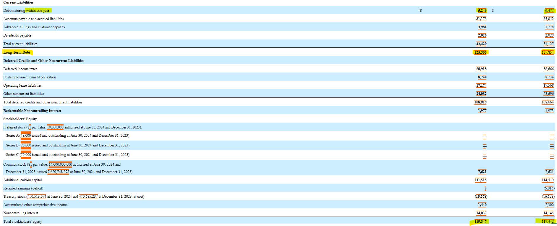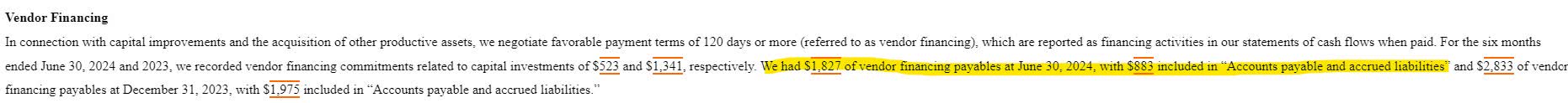 The company’s free cash flow generation was sufficient to cover the combined $5.5 billion dividend and vendor financing obligations. The remaining free cash flow, combined with more than $3 billion of cash on hand, was used to pay down long-term debt by nearly $7 billion. It appears as if the drop in vendor payments is expected to continue through the remainder of the year as AT&T negotiates vendor financing 90 to 120 days out and has disclosed a comparable short-term liability to the first six months of 2024 versus 2023.