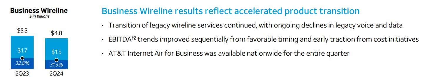 AT&T is undergoing a transformation from legacy wireline to fiber. The transformation requires the company to be able to grow fiber revenue commensurate with the decline in wireline revenues. AT&T still has $20 billion in annualized revenue in the business wireline space alone. While revenue has marginally declined, if a competitor gets to the wireline customers before AT&T does, it could result in a negative impact on earnings.