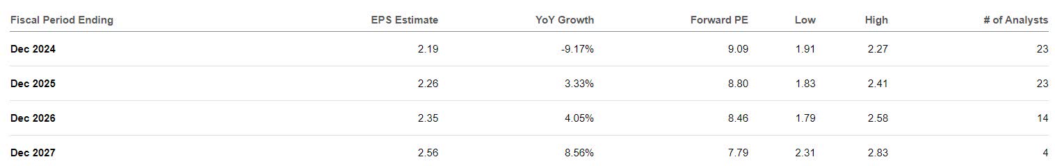 The transformation appears to be paying off, as AT&T is guiding full-year free cash flow between $17 and $18 billion, which would imply an increase in free cash flow of up to $1 billion for the second half of the year. Analysts are projecting earnings to grow over the next three years, albeit slowly. Despite the transformation working and earnings growth expected, AT&T is attractively priced at 9 times forward earnings.