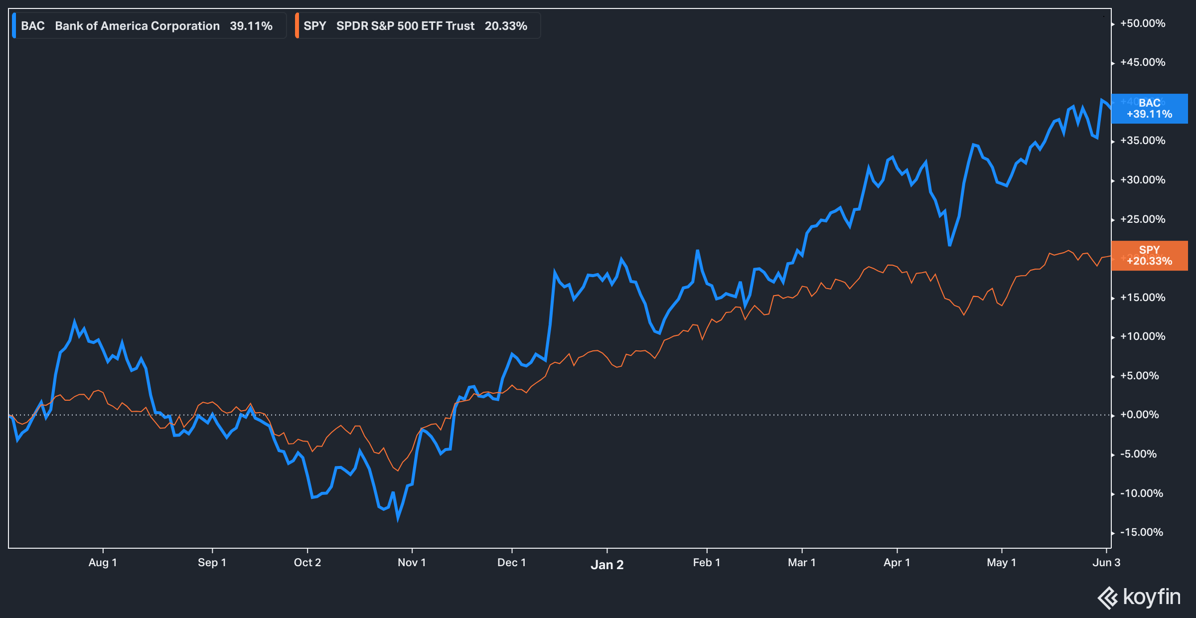 - Bank of America’s stock has outperformed the S&P 500 with a 39% total return since July 2023.