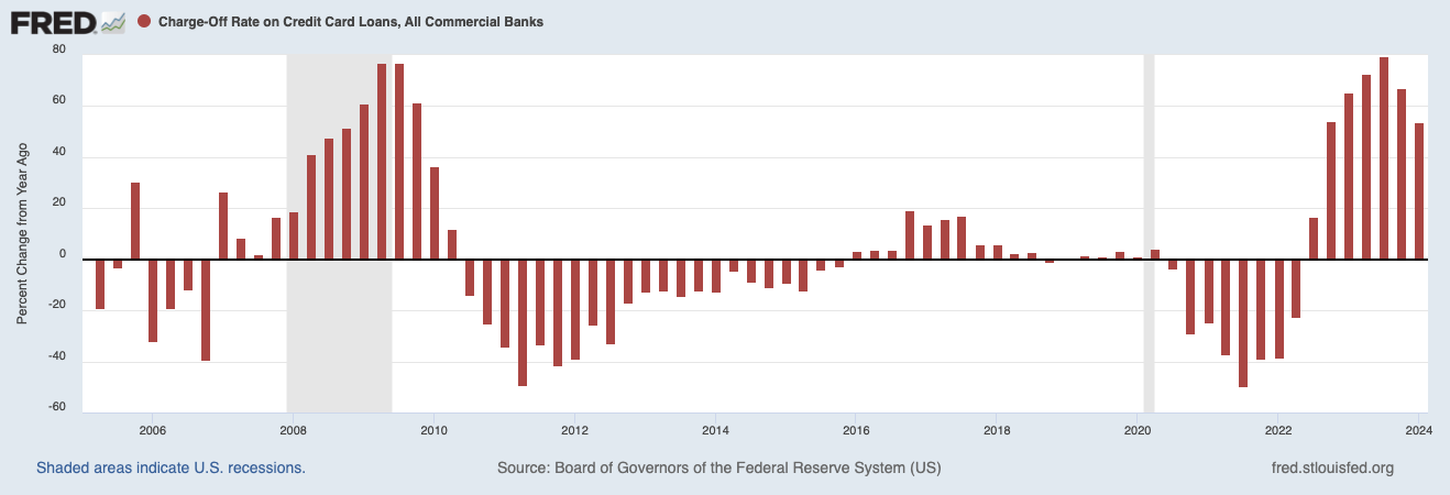 Commercial Bank Credit Card Loan Charge Off Rate, % change from one year prior (FRED)