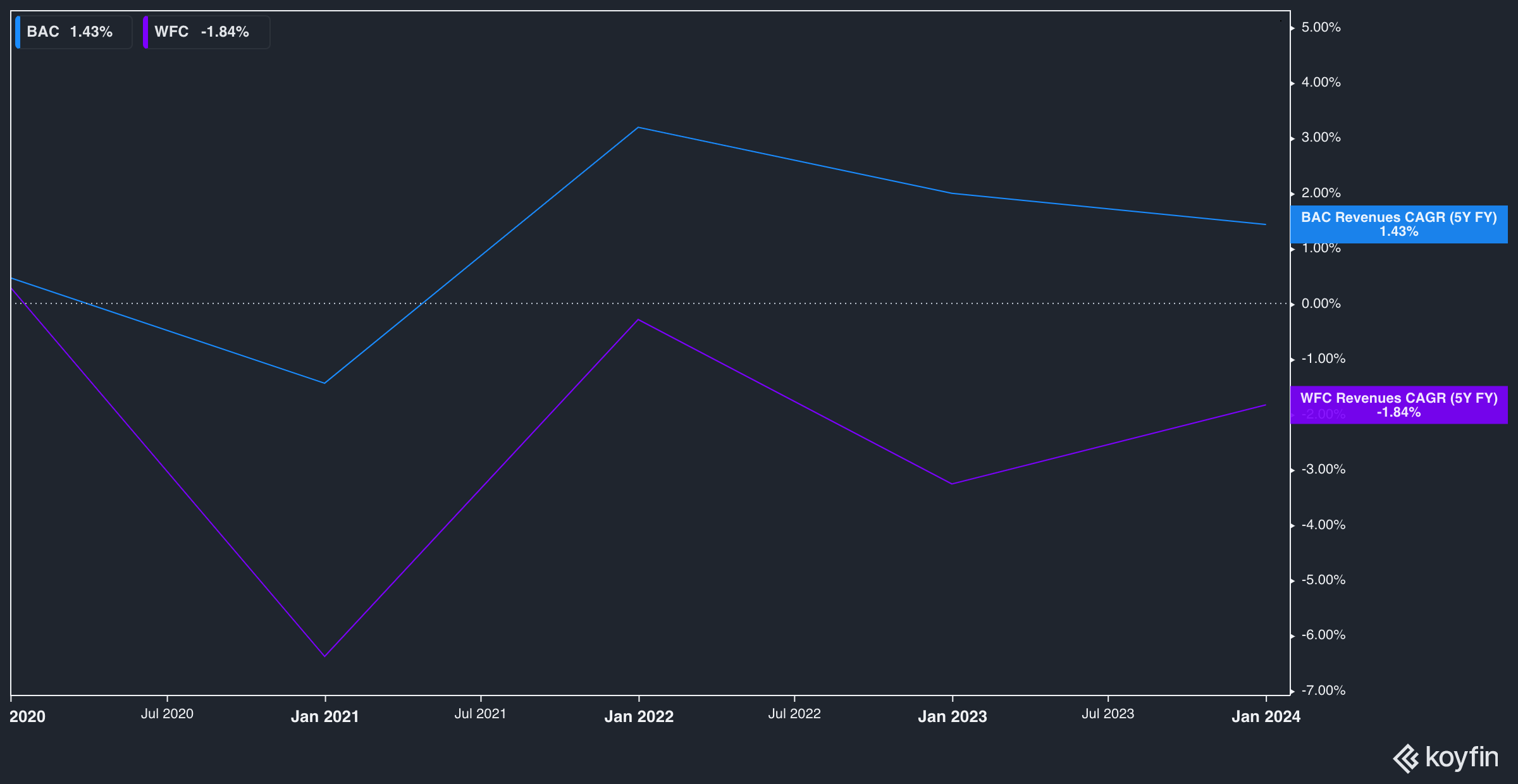 WFC vs BAC, 5yr Revenue CAGR (Koyfin)