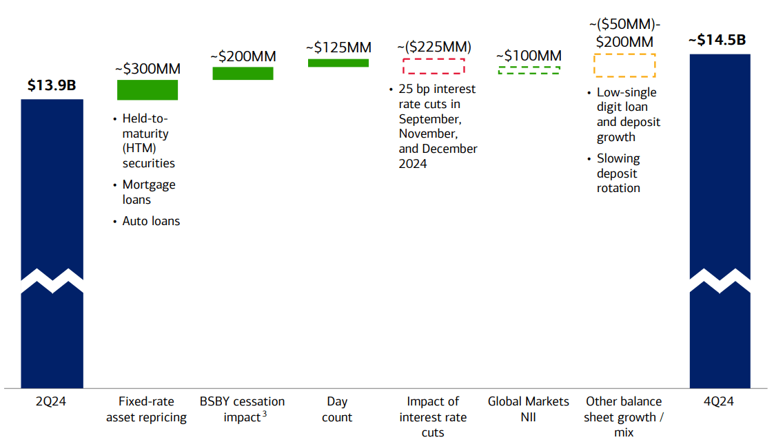 According to the forecast presented as part of the 2Q24 presentation, the bank anticipates, despite penciling in three interest rate cuts in 2024, to grow its net interest income by a substantial $600 million over the 2Q24 level.