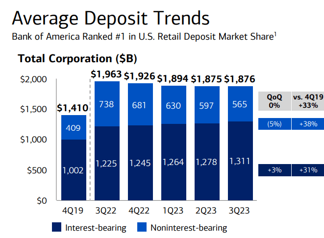 On a consolidated basis, Bank of America reported deposits of $1,876M at the end of the September quarter compared to $1,875M in the June quarter, meaning deposits edged up slightly quarter over quarter… which is good news for Bank of America which saw a continual erosion of its deposit base in the last year. Growth in interest-bearing accounts offset a continual drop in non-interest bearing accounts in the third-quarter.