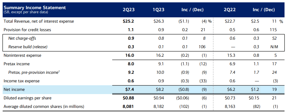 It appears banking remained good in the U.S. in the second-quarter, despite a major regional banking crisis unfolding in Q1’23: Bank of America reported its second quarter of strong net income in FY 2023, with profits totaling $7.4B, showing an increase of 19% year-over-year. Net interest income tailwinds boosted Bank of America’s earnings, as they did in the previous three quarters.