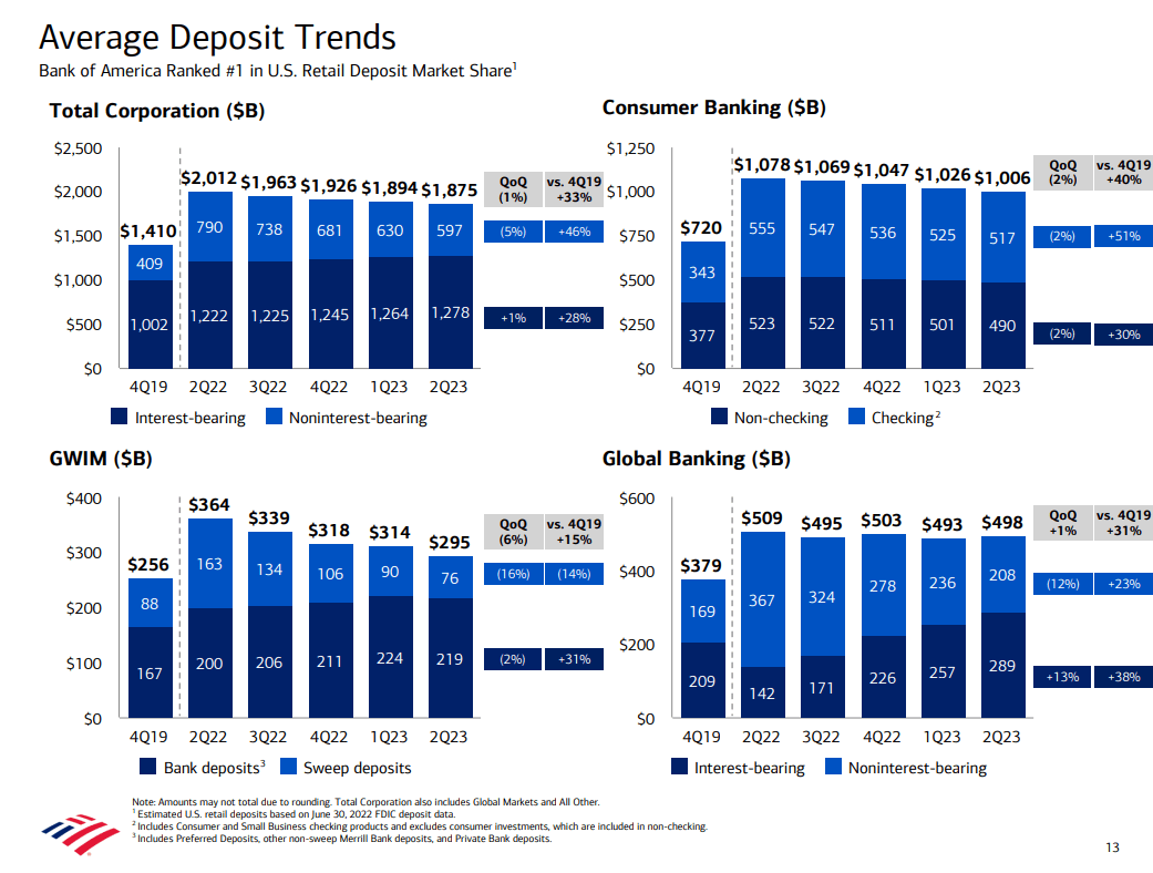 Bank of America’s deposits continued to decline across its different businesses (with the exception of Global Banking), which is a reflection of depositors and savers moving funds into higher-yielding assets, but the deposit base is shrinking much slower than it did in the previous three quarters.