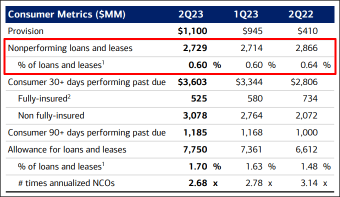 Bank of America’s portfolio quality remained admirable in Q2’23 and although the bank has seen a small increase in its net charge-off ratio (which was up 0.06% quarter over quarter), the overall percentage of non-performing loans/leases remained at just 0.6% of the bank’s total. This means that the bank has healthy loan quality and Bank of America’s consumer metrics do not show a deteriorating trend in loan quality at all.