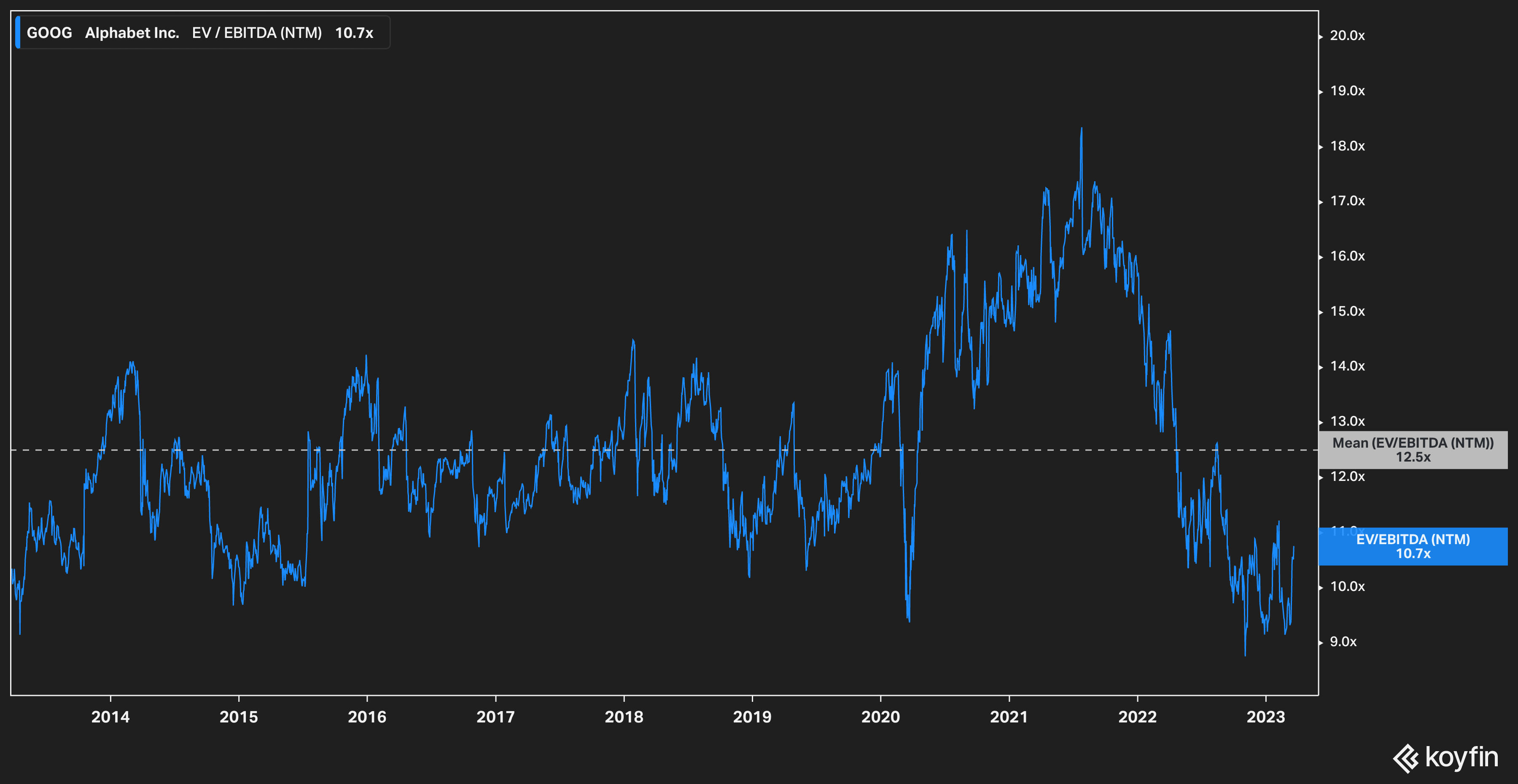 On most timeframes, Google is trading below historic forward EV/EBITDA averages. The current valuation of 10.7x is well below the 10-year average of 12.5x, and we point out that previous valuations do not even include a premium for what an AI-integrated Google has to offer investors.