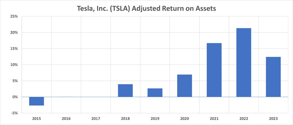 Throughout the years, and especially after 2019, Tesla’s adjusted ROA surged higher and reached 21% in 2022.