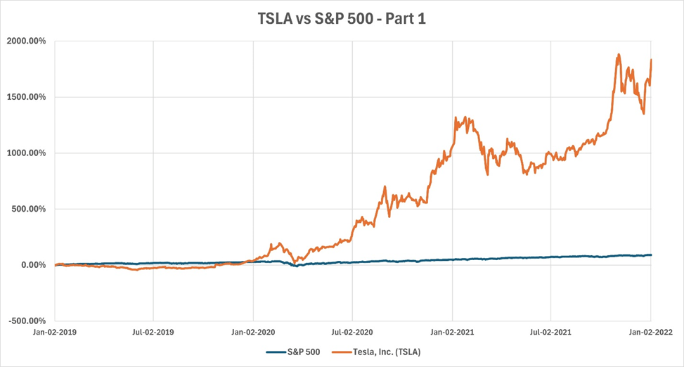 The story I told above about how Tesla took off and became immensely more successful after 2019 can be observed by looking at the stock. See it below. The surge of the Tesla stock makes the jump of the S&P 500 index look insignificant, which actually nearly doubled in three years from the beginning of 2019 to the end of 2021.