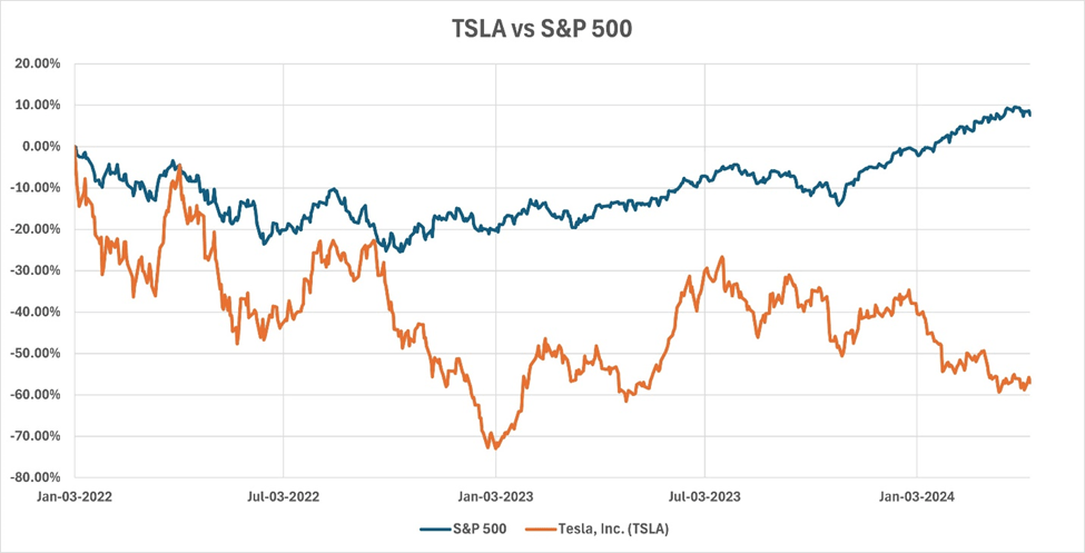 At the end of 2021, Tesla was seen as a very high-growth company, not as a traditional car manufacturer. And this made sense, to some extent. However, indications of the company struggling to grow as much began in 2022. Until now, Tesla investors have been hit with mostly negative news. In 2022, the stock was down nearly 70%. While it recovered a bit in 2023, investors holding the stock since 2022 are still in the red.