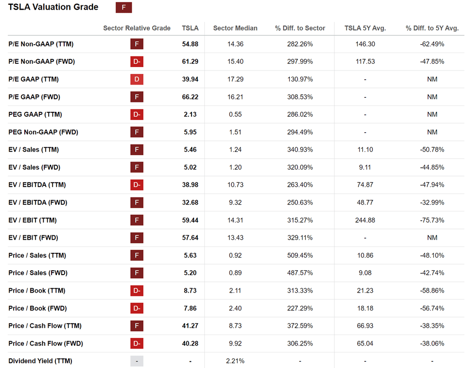 One could think that after this huge decline, the stock is now cheap. However, by various measures, it still looks expensive. Find below Seeking Alpha’s valuation grades based on different multiples, which have never been better than a D since 2021. A comparison of Tesla’s multiples to the sector median shows that the market still prices Tesla as a high-technology growth company rather than a car manufacturer, which is what it really is.
