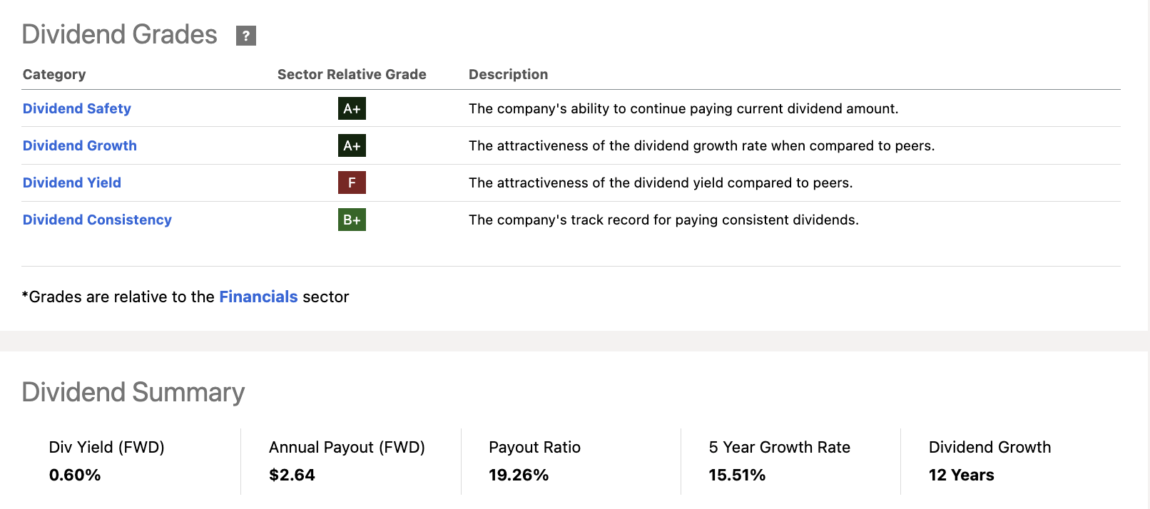 Hence, it also makes sense that the company’s dividend yield is the only component of the dividend scorecard that comes with a poor grade. It scores A+ on both safety and growth.