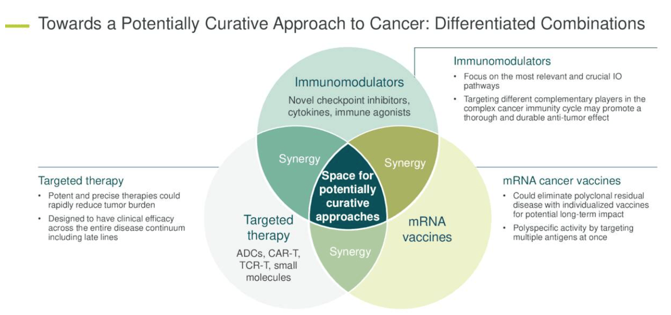 BioNTech has three different categories of oncology focused drugs – immunomodulators, targeted therapies, and individualised and off-the-shelf messenger-RNA vaccines – as we can see below, BioNTech believes there are plenty of synergistic opportunities between the three approaches.