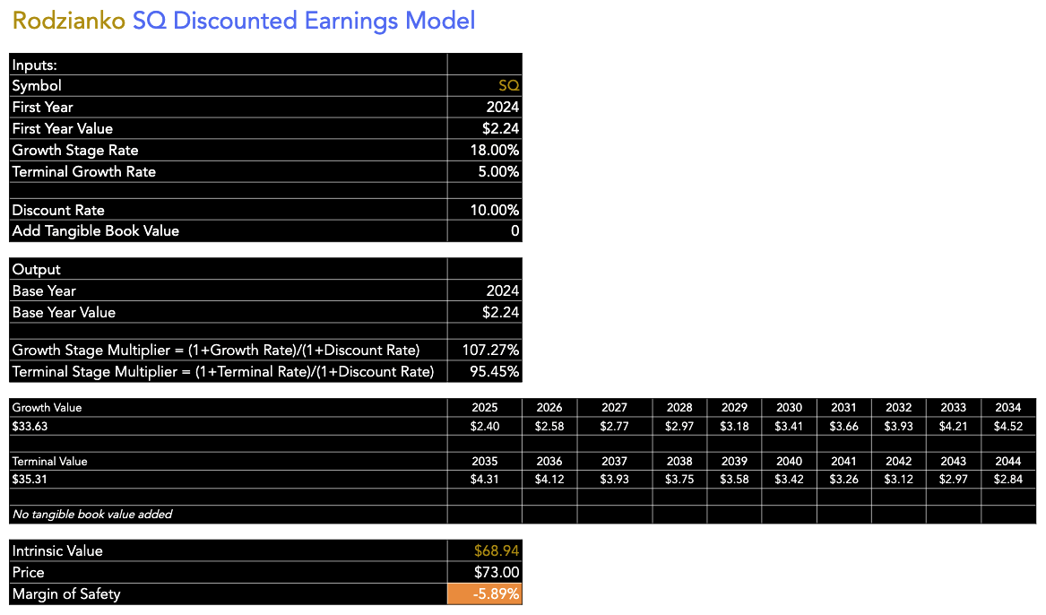 For my discounted earnings model, I used a 10% discount rate, as I consider this the market standard annual return. Additionally, I used a 5% EPS without NRI annual growth rate for my terminal stage because I believe the company will grow higher than the overall economy on average from 2034-2044, which is more likely to be between 2-3%. Based on analyst consensus estimates on Seeking Alpha and my own estimates of continued growth in alternative finance platforms rooted in technology, I think an 18% EPS without NRI growth rate is achievable by the firm on average over the next decade. This indicates an intrinsic value for Block stock at this time of $69. The current stock price is $73, indicating a slight overvaluation of 5.9%. However, because of the high investor sentiment around SQ that, I believe, will be enduring and the good growth rates I forecast over the next 20 years, I believe that it is reasonable to propose that the stock is a Buy at the current price.