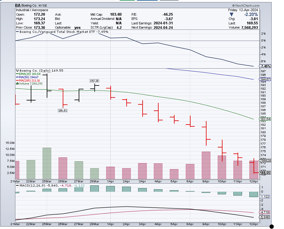 - Boeing stock has underperformed, dropping 25% relative to the S&P 500 over a 3-month period.