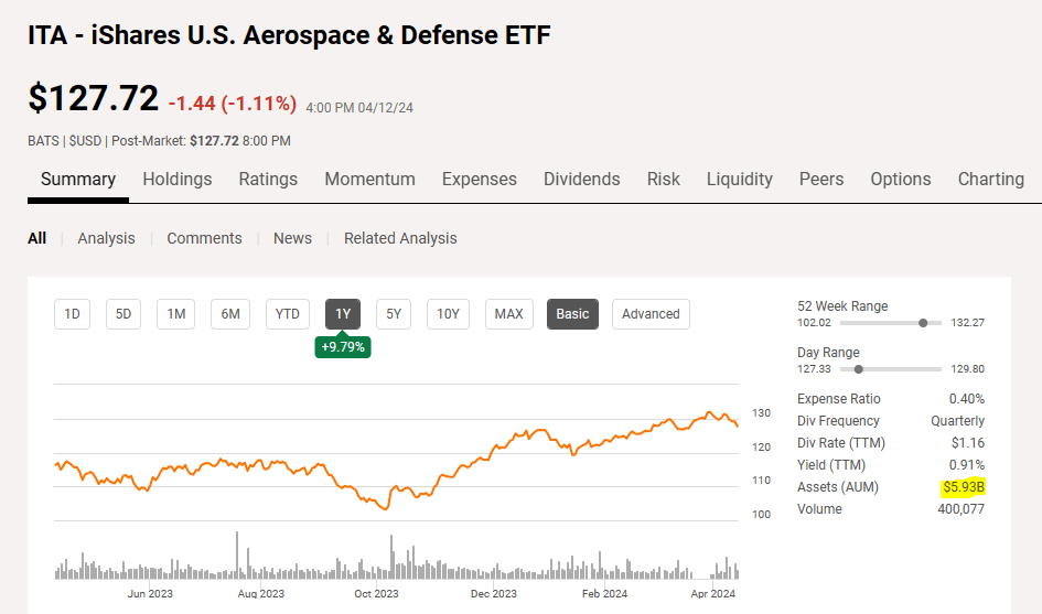 Of course, as we write this, there is a significant escalation of conflict in the Middle East. We will be opining on the geopolitics to the newly minted experts on X. But we can attest to the fact that these conflicts tend to move money flows at least for a short while. The largest ETF we follow here is the iShares Aerospace & Defense ETF (ITA). The fund has almost $6.0 billion in assets.