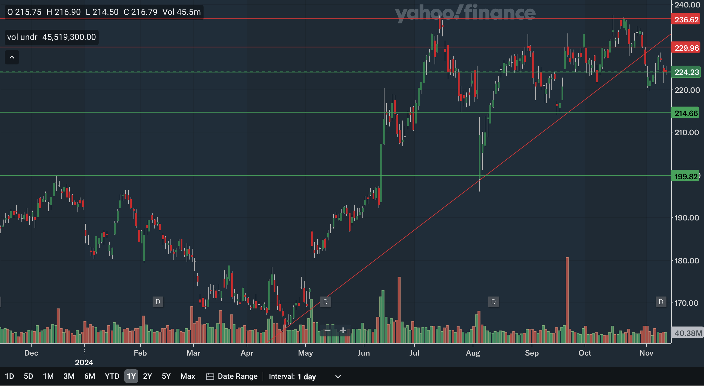 Apple just very recently broke a key short-term uptrend line, a major negative. This uptrend stretched back to April of this year and was important support on many occasions. The nearest source of resistance would be at around 230 as that level was resistance in August and September. The next level of resistance would be the former uptrend line. However, it is sloping up quickly and is likely to move out of range in the coming months. The last resistance area would be the all-time high of around 236. It looks like a double top may have formed, as the peak in October failed to surpass the high set in July. As for support, the nearest area would be in the mid-220s with that price level being both support and resistance in the second half of this year. Moving down, we also have support in the mid-210s with that zone being key support in July and September. Lastly, the psychologically important 200 level is distant support, as it was resistance back in late 2023 and was support during the August crash. Overall, I would say the daily chart reflects a bearish short term for Apple, as the breakdown from the uptrend line and double top are significantly negative signals.