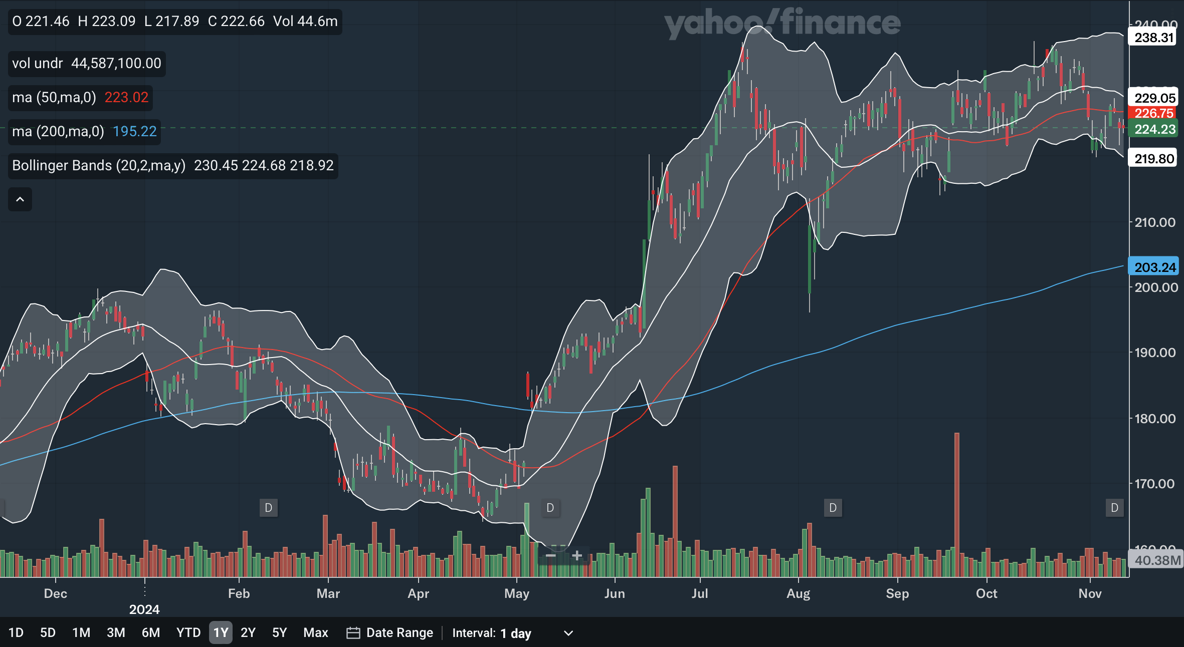 The 50-day SMA crossed above the 200-day SMA in June this year, a bullish indication. While the gap between the SMAs has remained quite healthy, the stock is currently trading below the 50-day SMA, which is an indication of weakness. The 50-day SMA has also developed a downward trajectory, and so it may further pressure the stock in the near future. For the Bollinger Bands, the stock broke beneath the 20-day midline in late October, another indication of weakness. The stock recently hit the lower band showing it was oversold and bounced but was rejected by the midline, showing that the midline has now become resistance. From my analysis, despite the 50-day SMA still being above the 200-day SMA, the many signs of weakness show that the short-term outlook for Apple is beginning to be bearish.