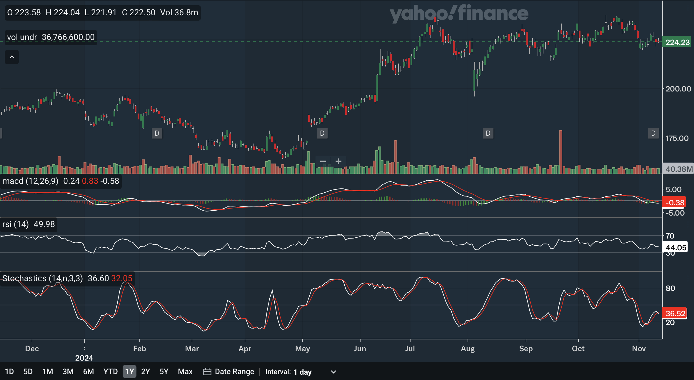 The MACD crossed below the signal line in October, a bearish signal. Furthermore, after the gap between the lines briefly narrowed, the MACD is pulling away from the signal line again, an indication of renewed bearish pressure. Also, note that while the stock has remained at quite high levels relative to the past year, the MACD is now far below levels seen in July. For the RSI, it is currently at 44.05. The RSI breaking beneath the critical 50 level back in October shows that the bears have taken control of the stock. Lastly, for the stochastics, the %K line just broke below the %D line, yet another bearish signal, although the crossover did not occur within the overbought 80 zone. In my view, there is not much to like about Apple stock when evaluating these daily indicators, as they show bear signals galore.