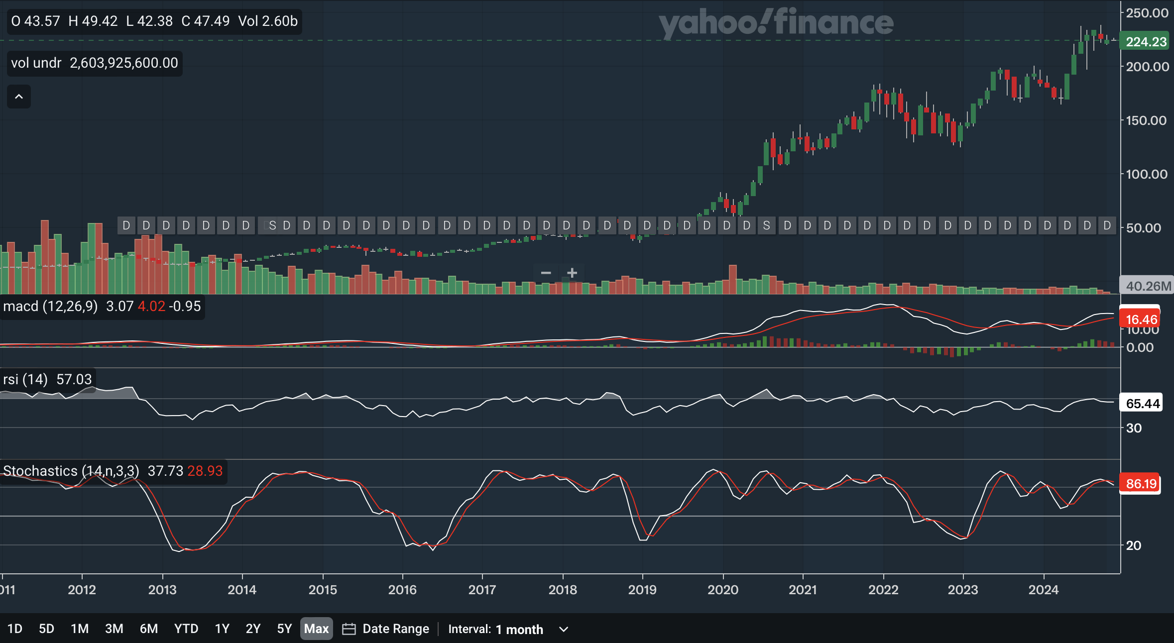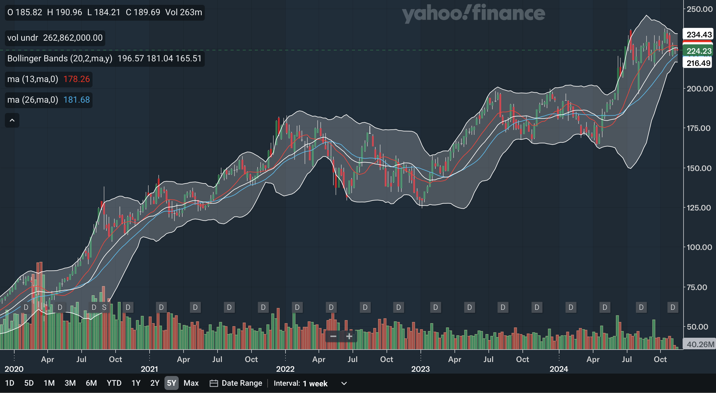 The 6-month SMA crossed above the 10-month SMA early this year, a bullish indication. The gap between the lines has widened significantly, but recently the 6-month SMA has lost a bit of momentum while the 10-month SMA continues it sharp accent. The stock just recently broke below the 6-month SMA, an indication of weakness. For the Bollinger Bands, the stock was at the upper band for quite a while earlier in the year, showing it was overbought. The recent pullback is therefore not too surprising. The stock has remained above the 20-month midline since very early 2023, showing that the long-term uptrend has been intact for almost two years now. Overall, I would say that the monthly MAs are net positive, but the stock moving below the 6-month SMA is a red flag that investors should monitor to see if the stock continues to drop further beneath the line or whether it can reclaim the line as an indication of strength.