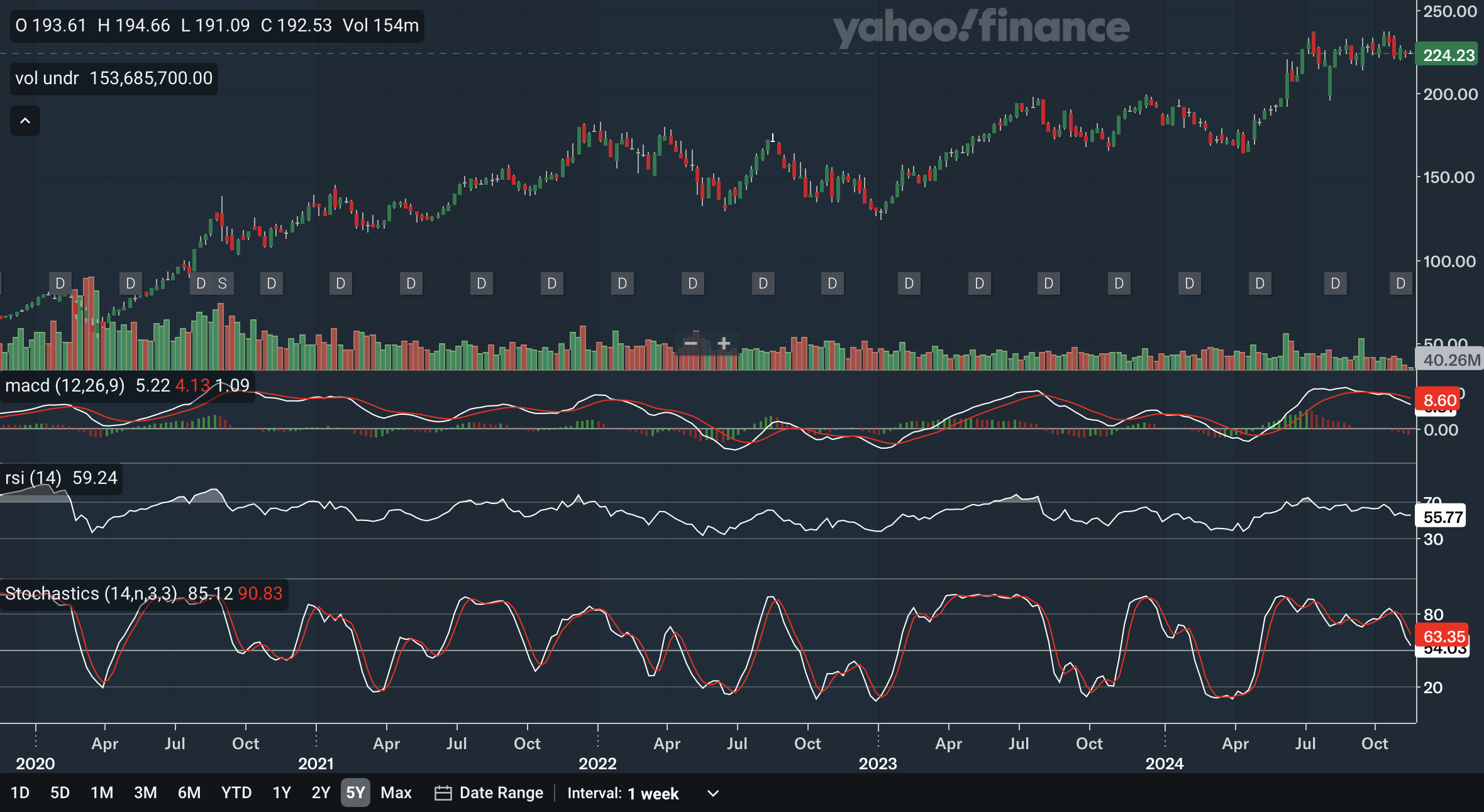 Intermediate term bearish signals continue in the weekly indicators. The MACD crossed below the signal line earlier in the year, a negative indication. Since then, the gap has only gotten wider, showing that bearishness has been rising. For the RSI, it is currently at 55.77 and holding above the critical 50 level which is a positive. However, the RSI also shows negative divergence, as the all-time high in the stock earlier in the year was met with an RSI that failed to best the peak seen in 2023. This is an intermediate term top failure swing, a highly bearish development. Lastly, for the stochastics, the %K has dropped below the %D back in October right at the overbought 80 zone, which is once again a highly negative indication for the stock. In my view, these weekly indicators have been very bearish, with every one of them showing some sort of weakness with Apple.