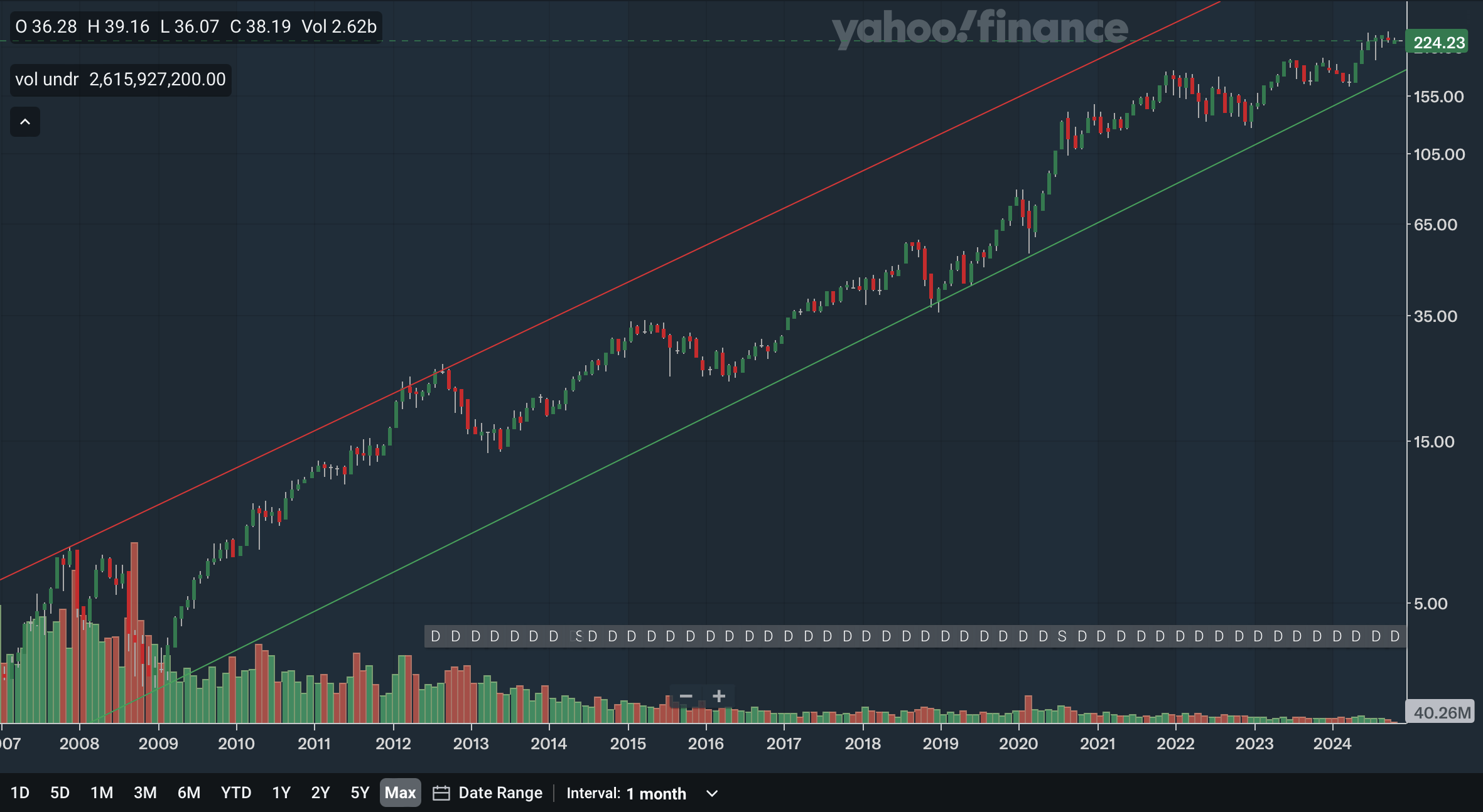 The weekly chart is the first positive for Apple, as the stock remains bound in an upward channel. This channel dates back to 2020. The only source of resistance in the intermediate term is the upper channel line. The stock could experience modest gains even if it were to remain under this line. For support, the nearest level would be at around 200. This area was already discussed in the daily analysis, but here we can see its significance stretches back to mid-2023. Moving down, we have support at 180 as that level was strong resistance back in late 2021 and in 2022. The lower channel is currently also at 180 and is becoming increasingly relevant for the stock. Lastly, we have distant support in the mid-150s, with that area having been both support and resistance throughout the past years. Overall, this is the first sign of positivity with Apple stock, as there are no bearish indications here.