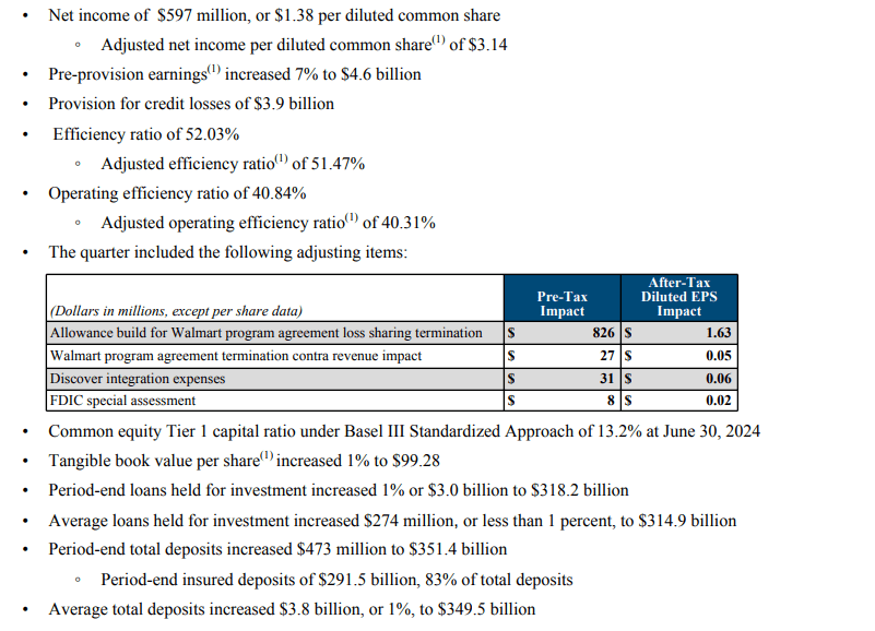 - Capital One had a strong Q2 with net income of almost $600 million, maintaining a strong efficiency ratio and increasing average deposits.