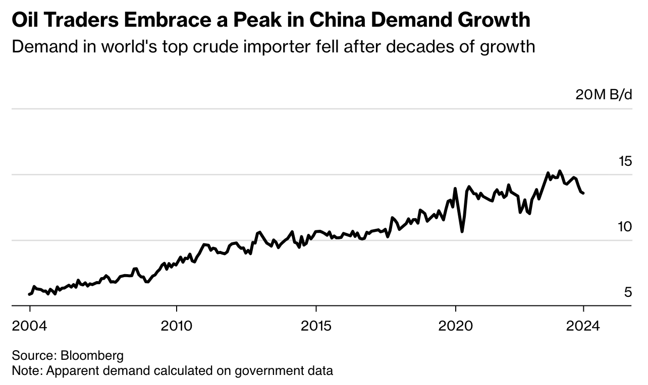 The chart below shows Chinese crude oil demand. Although we need to be careful, as this is based on government data (which is not always reliable in China), it makes sense that demand is down, pressured by weakening cyclical growth.