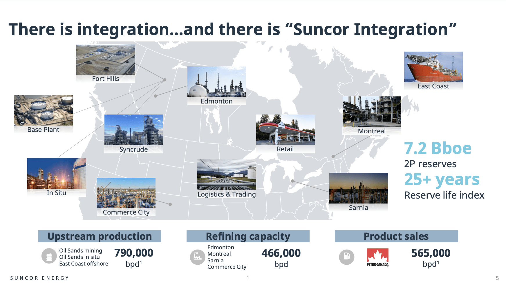 On top of producing close to 800 thousand barrels of oil per day, Suncor has the capacity to turn roughly 470 thousand barrels per day into value-added products. Its Petro-Canada whoselase marketing brand sells more than 560 thousand barrels per day to end-customers.