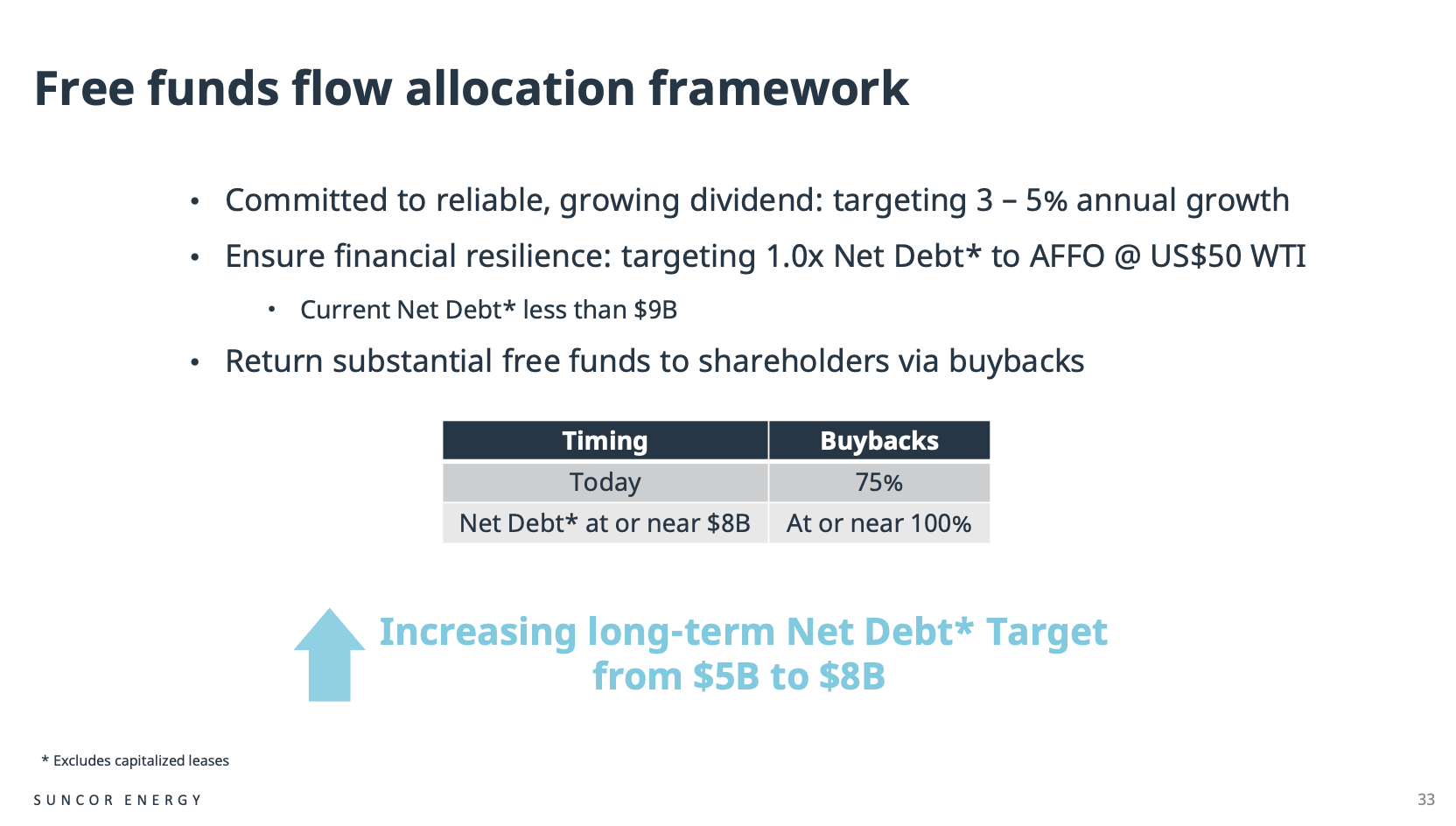 Currently yielding 4.5%, Suncor aims to grow its dividend by 3%-5% per year. It will distribute additional capital indirectly by using buybacks. In light of its current net debt situation, 75% of excess free cash flow is used for buybacks.