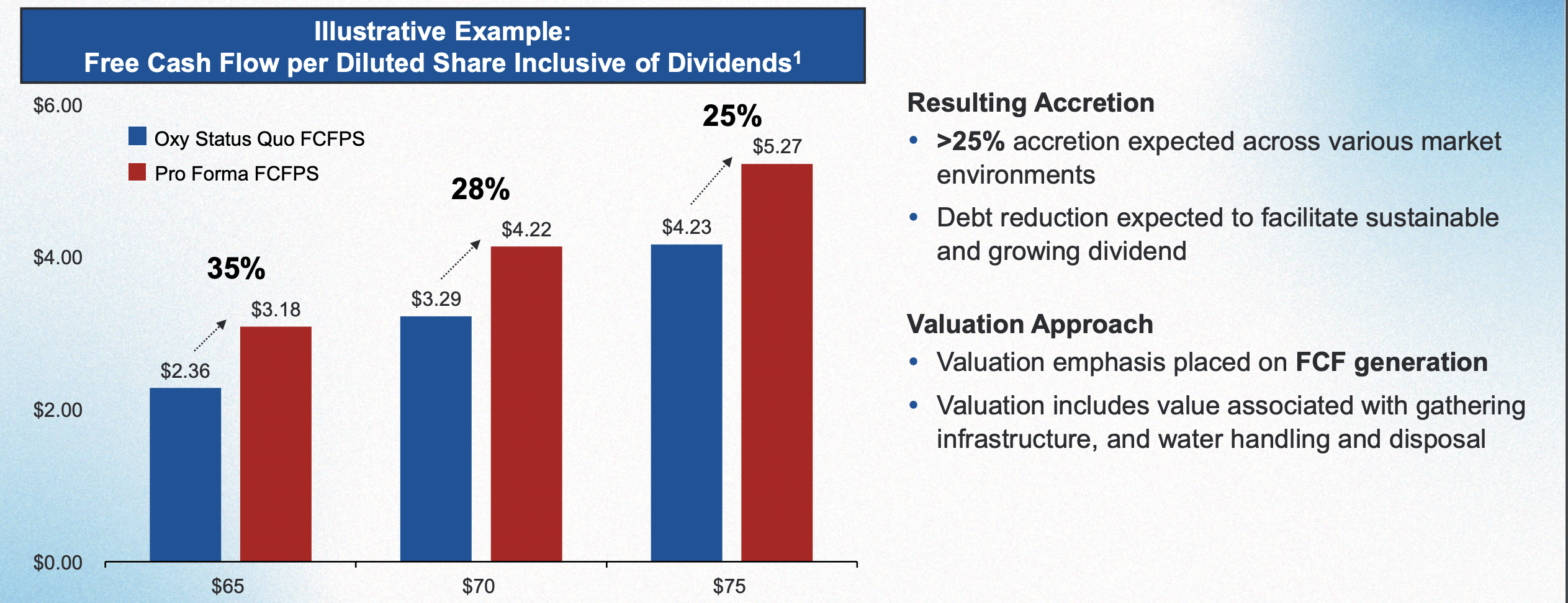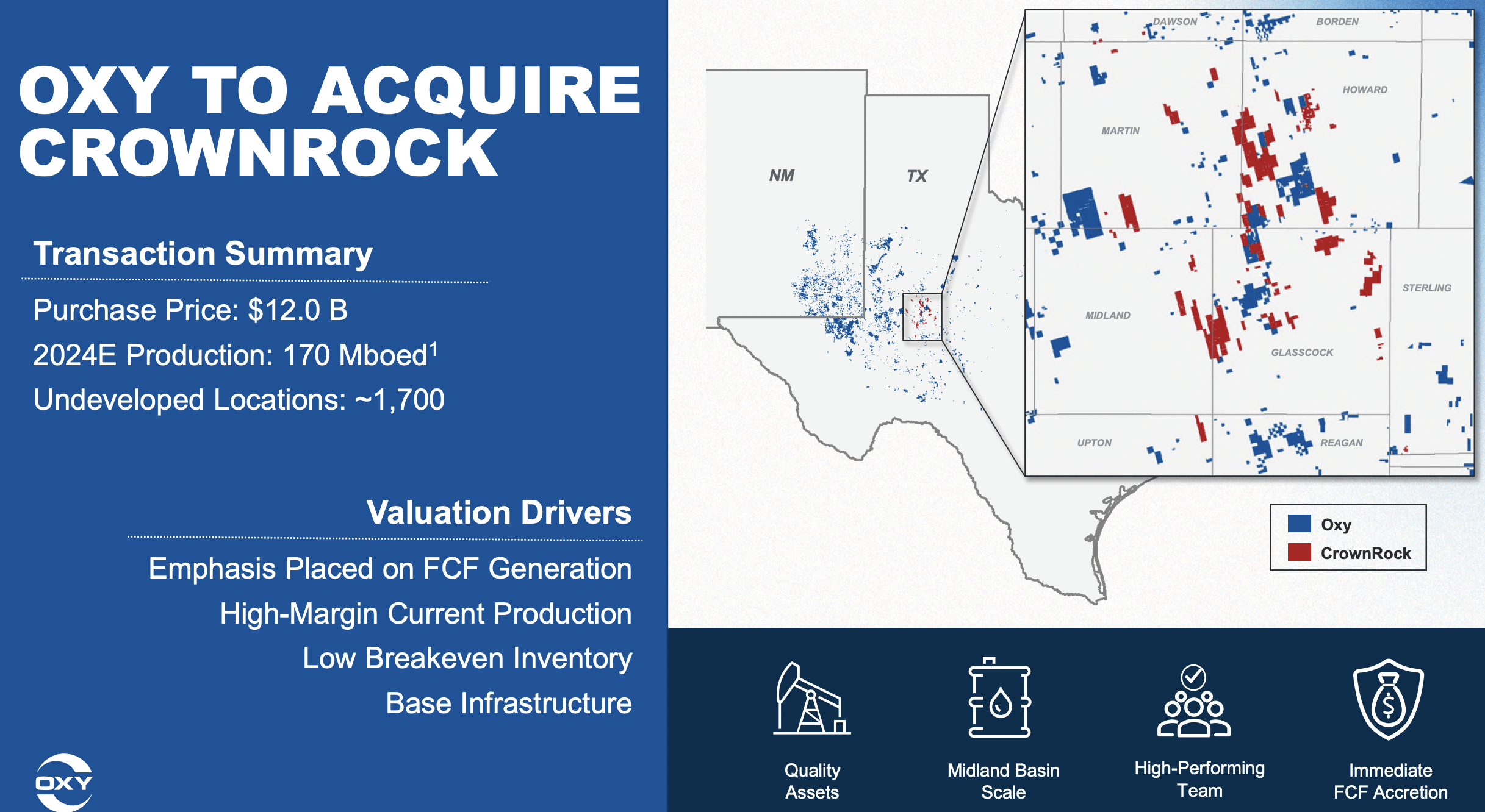 - Occidental’s CrownRock acquisition boosts production and FCF, enhancing shareholder value and positioning the company for strong returns at current oil prices.