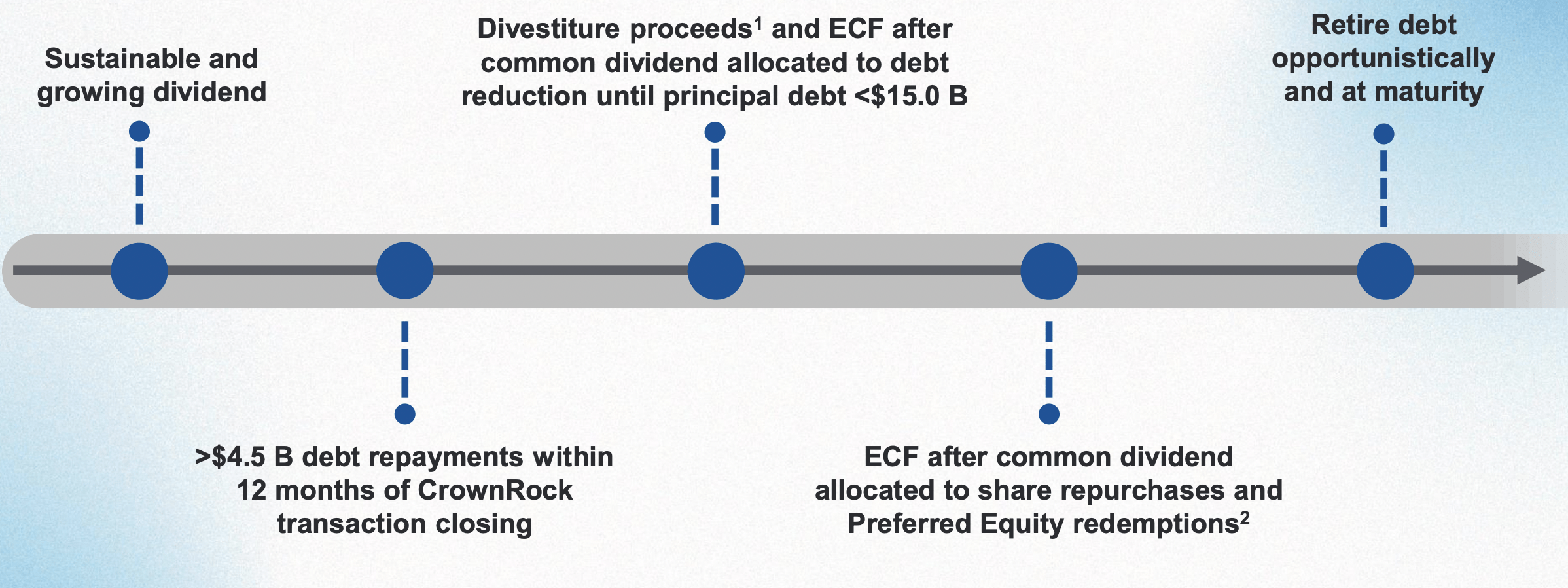 The company has a modest almost 2% dividend yield, but it’s paid off substantial debt since the CrownRock transition closing, and it’s planning to reduce principal debt to less than $15 billion. The company is now looking at share repurchases and preferred equity redemptions, with preferred equity terms mandating redemption at a 10% premium.
