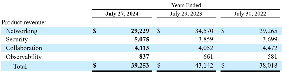 While the stock price has been volatile, the business remains largely the same. More than half of Cisco’s business is still networking equipment including routers, switches, gateways, and modems, while the security solutions and collaboration software the company provides make up 13% and 10.5% of total revenue, respectively. The smallest segment is observability, where the company provides network assurance, monitoring, and analytics offerings.