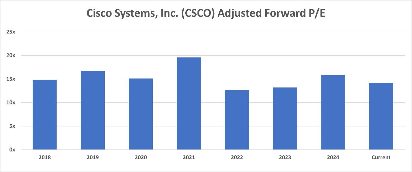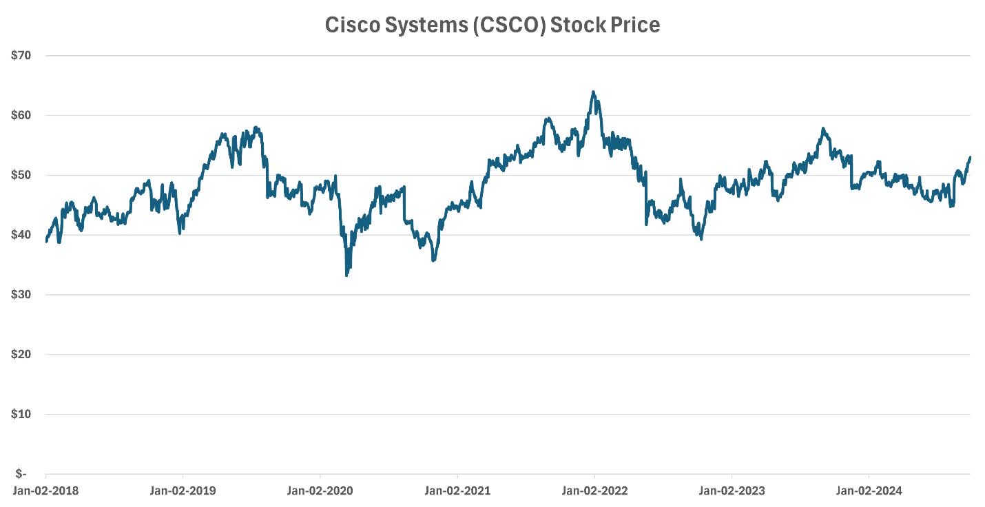 - Cisco’s valuation multiples have been trading within a narrow range for years, indicating limited upside potential unless the company delivers extraordinary results. As a result, Cisco receives a “Hold” rating.